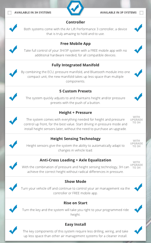 Includes manifold, controller, wiring harness, water trap, and mobile app compatibility for both iPhone and Android. Lifetime warranty on all Air Lift 3P management systems is included. The 3H & the new ALP4 upgrade is available for additional features.