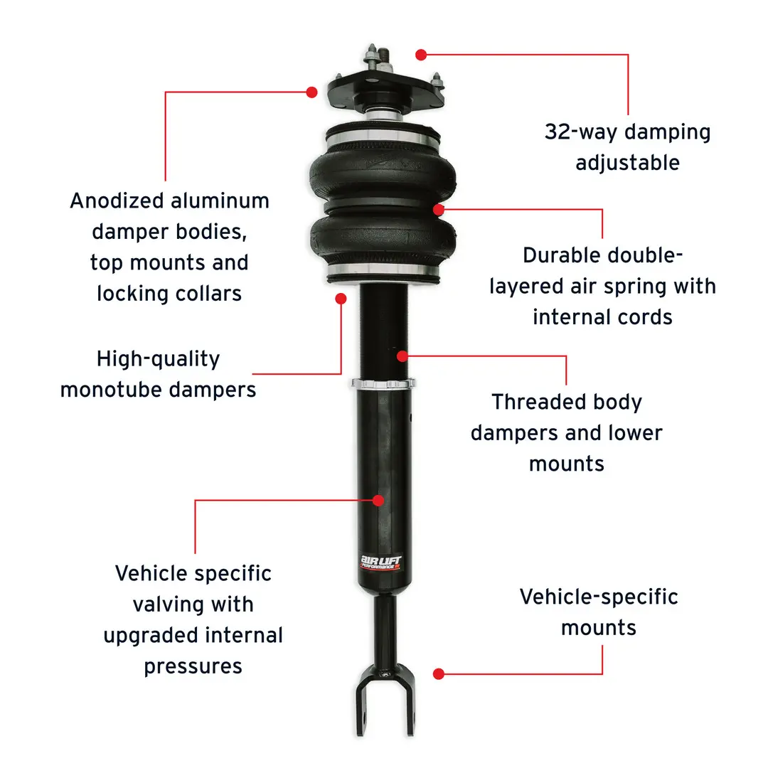 Lower your Infiniti G35 or Nissan 350z and raise your standards to Air Lift Performance. The front kit features progressive-rate, double-bellows air springs placed over high-performance monotube shocks. With 32 levels of damping adjustability and threaded adjustable lower mounts, the shocks allow for a wide range of flexibility.
