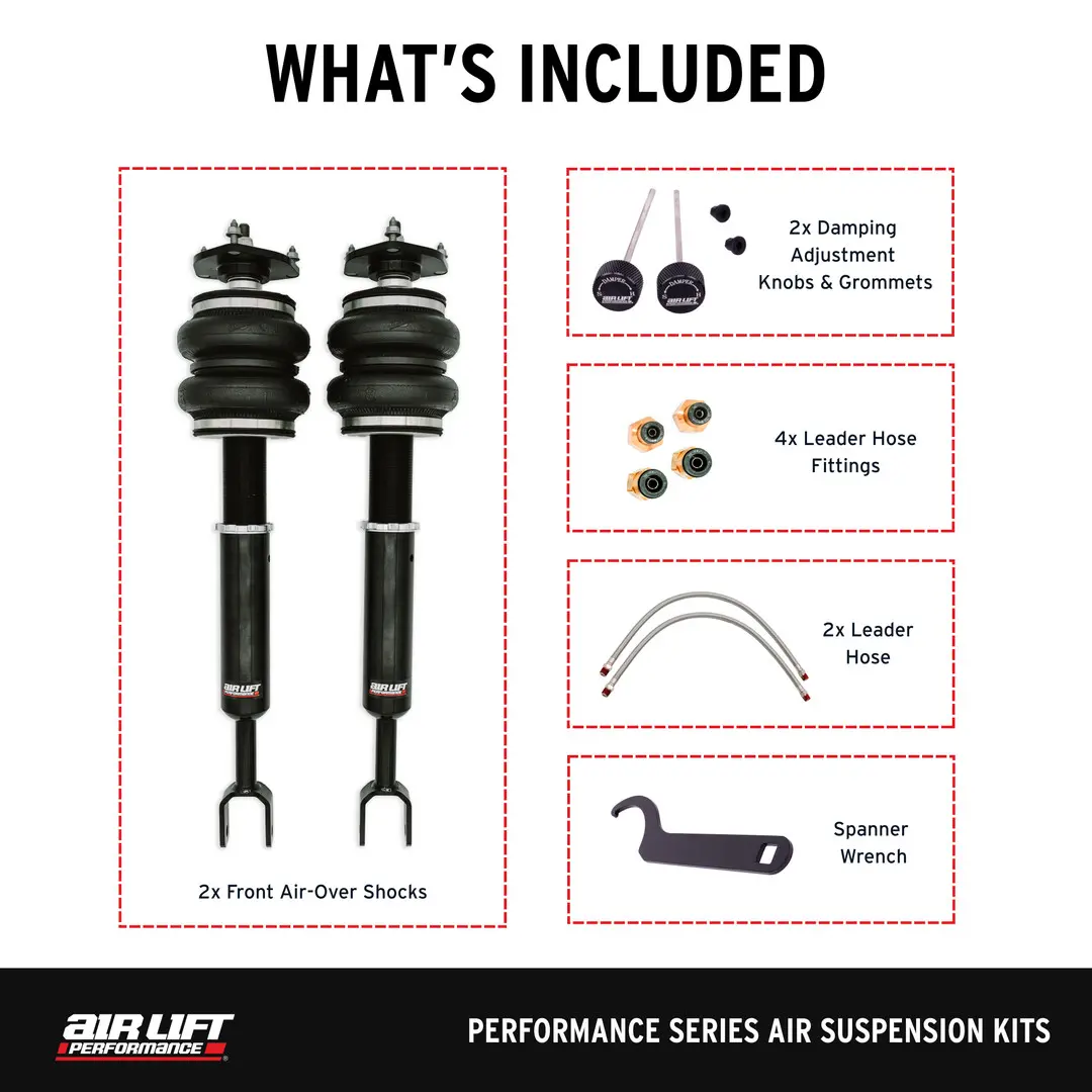 Kit Includes: Complete front Air Suspension kit with set of (2) front dampers with (2) air springs, (1) spanner wrench, (2) damping adjustment knobs, (2) damping knob grommets, (2) stainless leader lines, (2) 1/4" FNPT x 1/4" PTC fittings and (2) 1/4" FNPT x 3/8" PTC fittings.