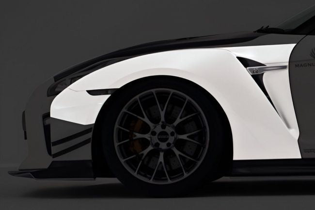 Introducing the Varis Magnum Opus ’18 Ver. Front Wide Fender Set with Extension Covers for the EBA-R35 Nissan GT-R, a high-end aero series for street enthusiasts, debuted at the 2018 Tokyo Auto Salon. This second evolution of the Magnum Opus for the R35 GT-R is compatible with MY17 models and offers a choice between FRP with twill weave carbon fiber accents or all-FRP versions. The set includes front bumper extension panels designed to fit seamlessly with the OEM Nissan front bumper cover. Adding +20mm per side, these fenders allow for larger wheel and tire setups, enhancing both performance and aesthetics. Transform your GT-R with the sophisticated and functional design of Varis Magnum Opus.