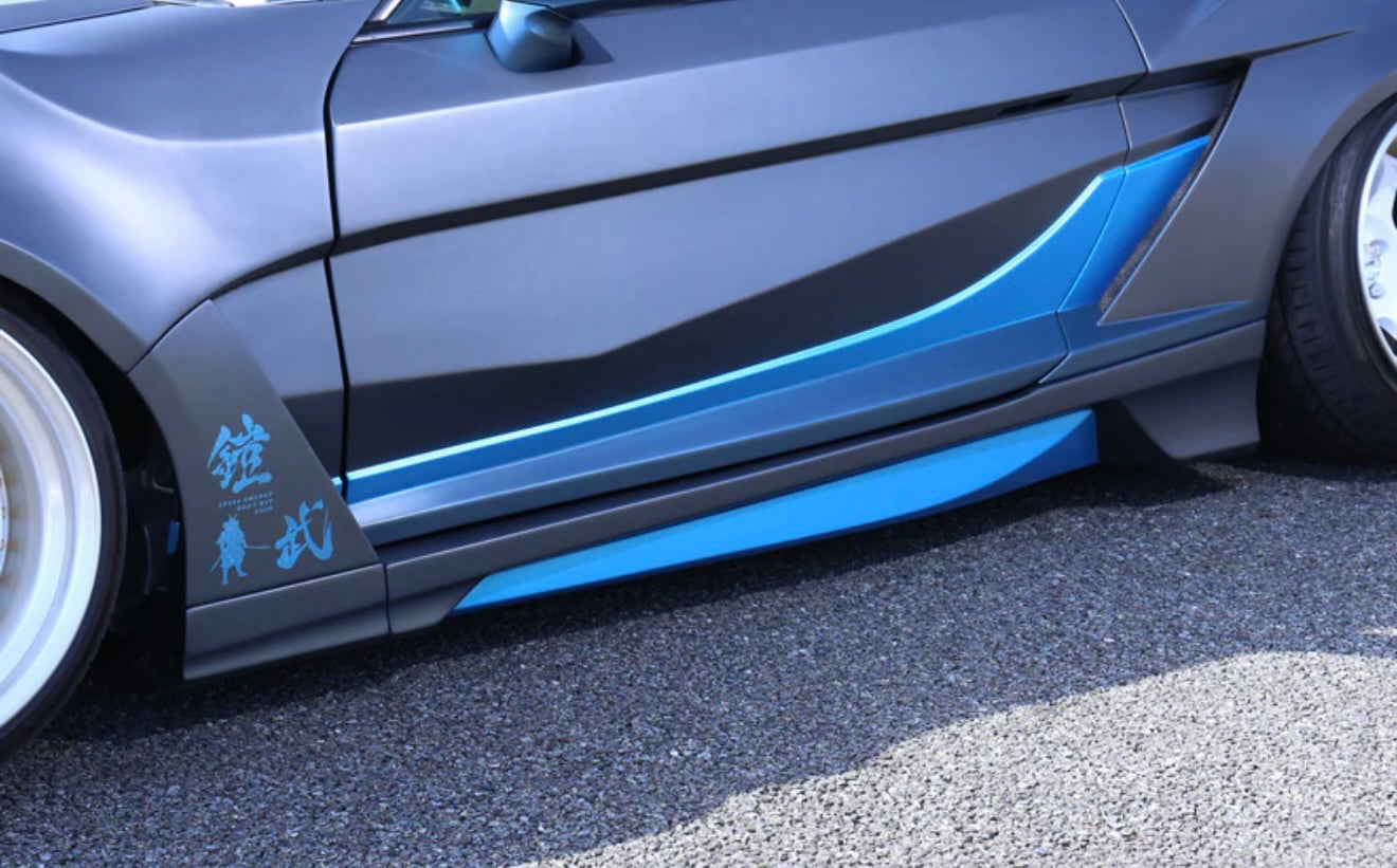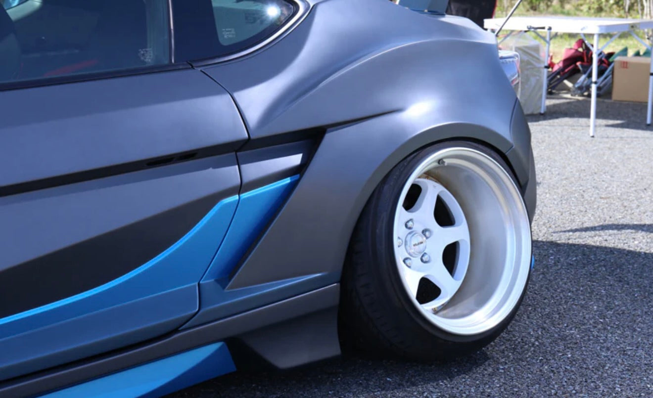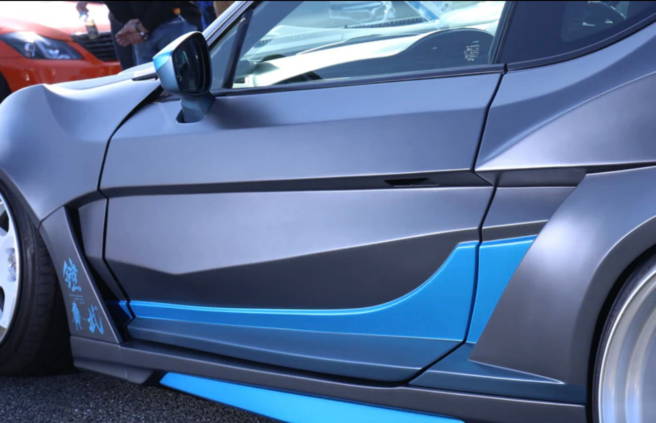 Front lip, side steps x2, rear diffuser, front 100mm wide fenders x2, rear 100mm wide fenders x2, door panels x2 (frp)