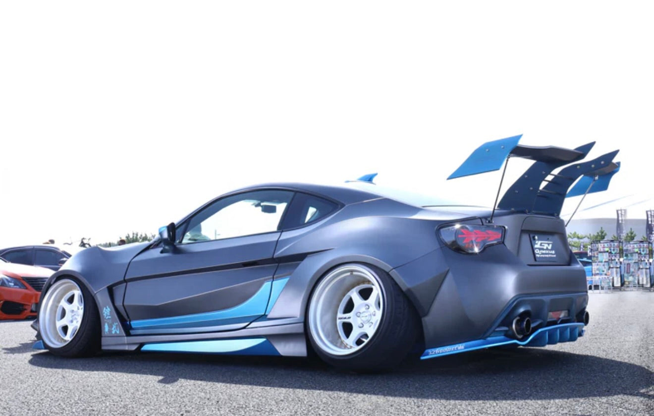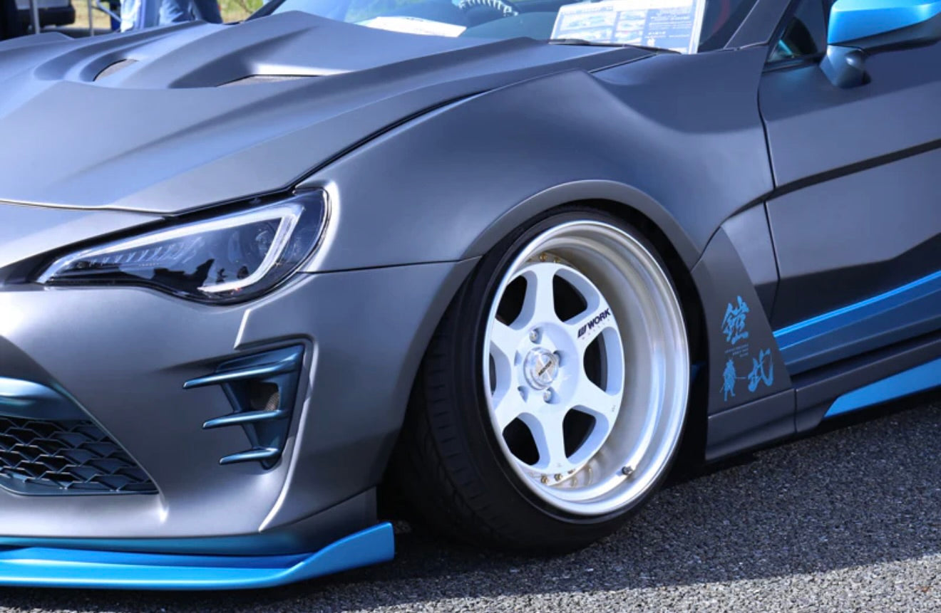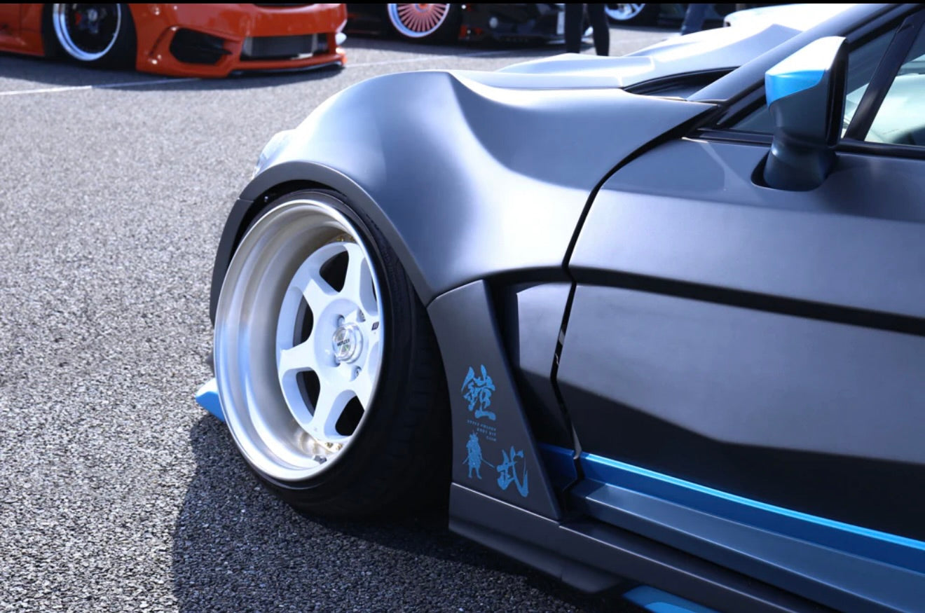 Front lip, side steps x2, rear diffuser, front 100mm wide fenders x2, rear 100mm wide fenders x2, door panels x2 (frp)